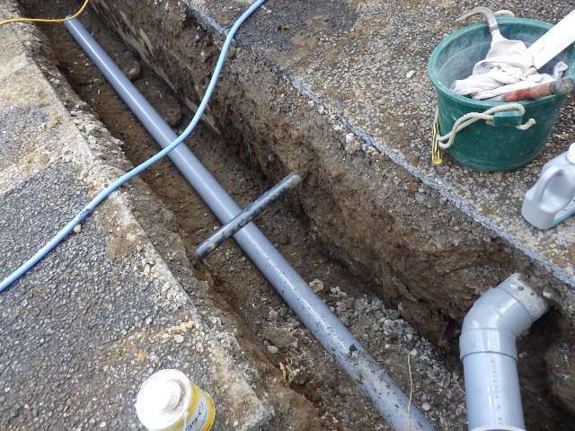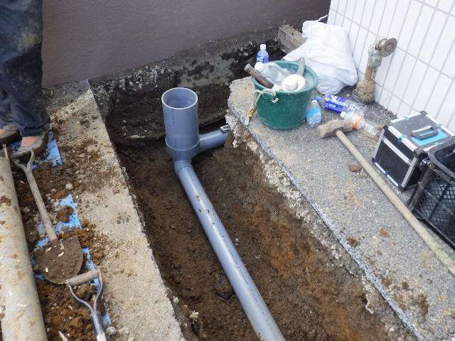 設計図に基づき、適切な勾配を確保した新しい塩ビ配管を正確に敷設しました。従来の勾配不良を解消するため、配管の傾斜角度を厳密に管理し、汚水や排水が確実に流れるよう施工しました。配管同士の接続部分では、専用の継手を使用して確実な接合を行いました。